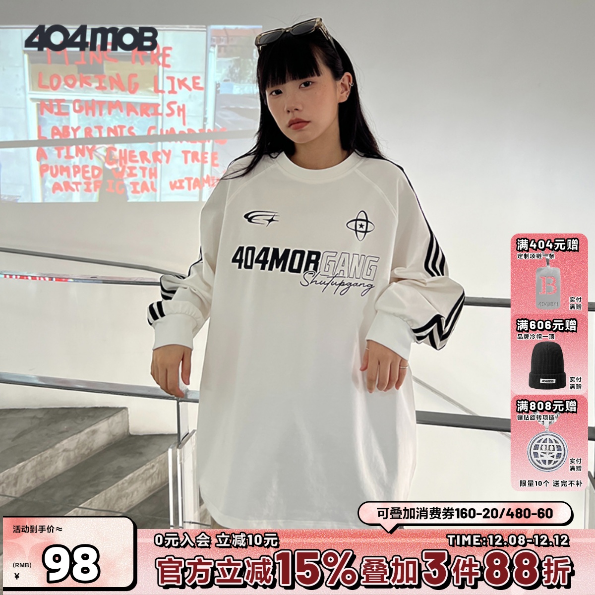 404MOB国潮牌情侣美式复古三条杠插肩长袖宽松重磅纯棉T恤男2024