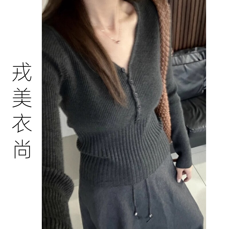 戎美衣尚韩系氛围花边低V领收腰纯羊毛衫女士修身打底毛衣针织衫