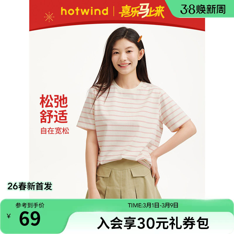 热风女士短袖T恤上衣条纹宽松内搭打底衫2026年春季新款短袖T恤