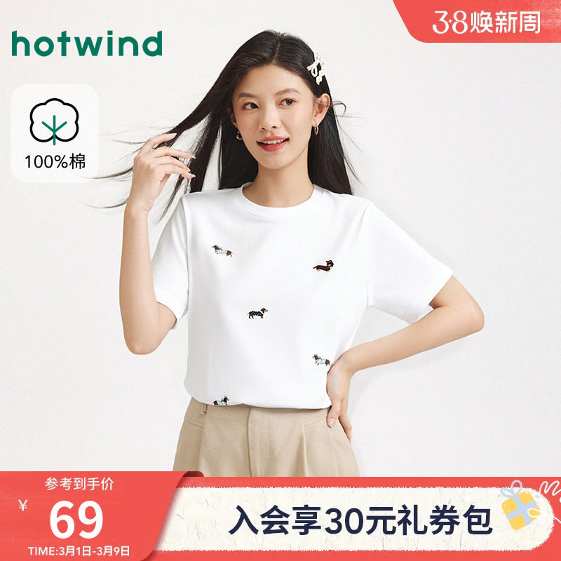 热风女士白色短袖T恤2025年秋季新款圆领动物图案宽松柔软棉上衣