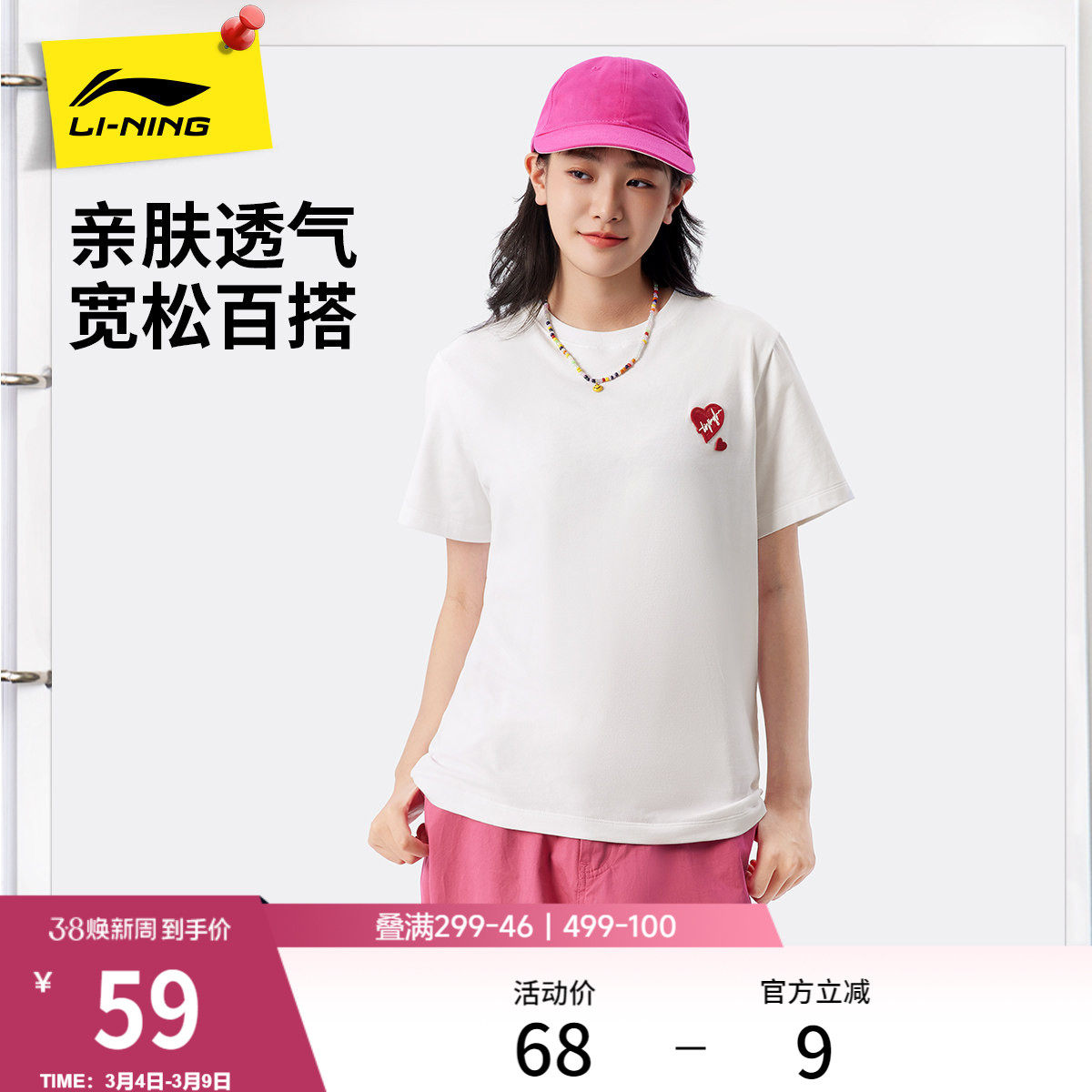 李宁短袖女士春夏新款爱心宽松上衣休闲印花白色T恤女针织运动服
