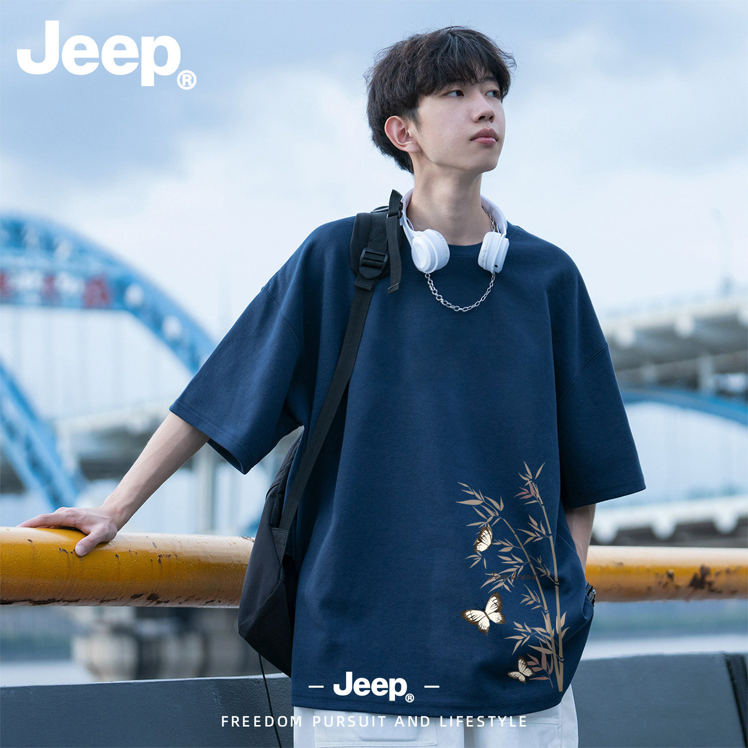 Jeep吉普男女士纯棉短袖T恤宽松休闲上衣圆领五分袖夏季透气衣服