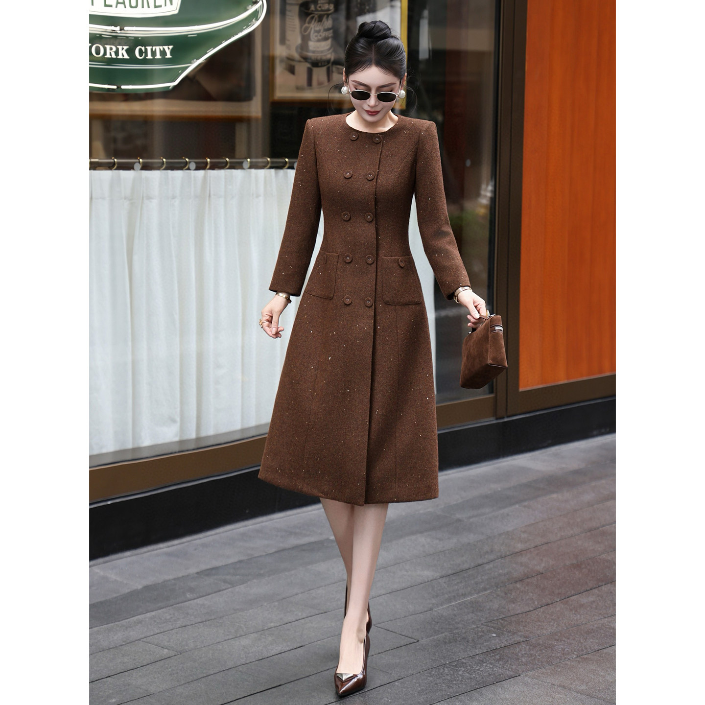 高级感双排扣优雅粗花呢连衣裙女中长款气质女神范咖啡色秋冬裙子