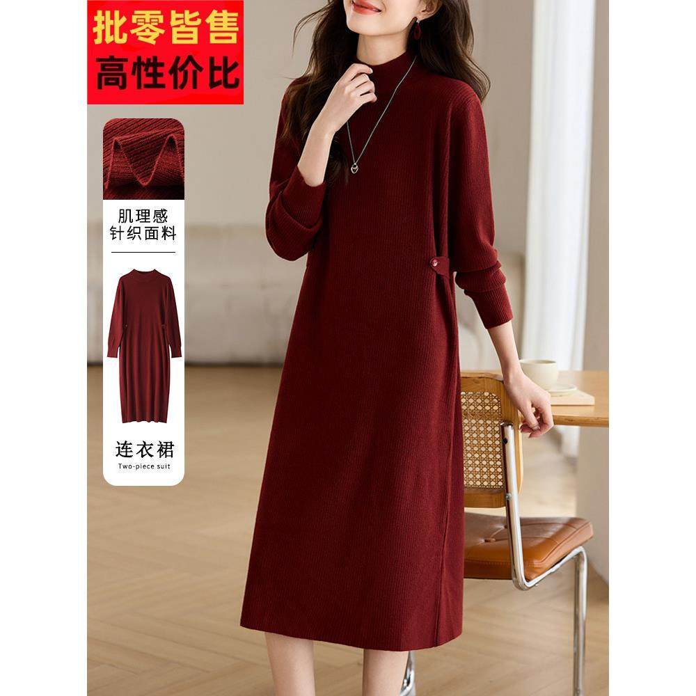红色针织连衣裙2025新款女秋冬高级感配大衣冬裙过膝长款毛衣裙子