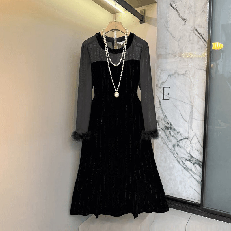 2025新款大方得体绝美冬裙长裙法式复古拼接网纱收腰连衣裙女装潮