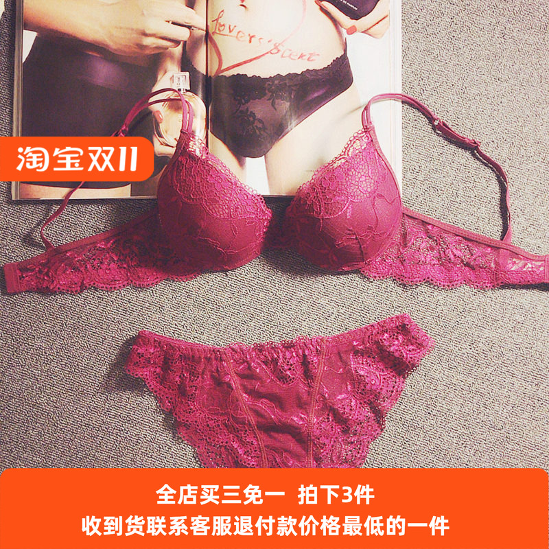 DK文胸套装超薄款欧美性感蕾丝透明大胸显小本命年红色结婚内衣女
