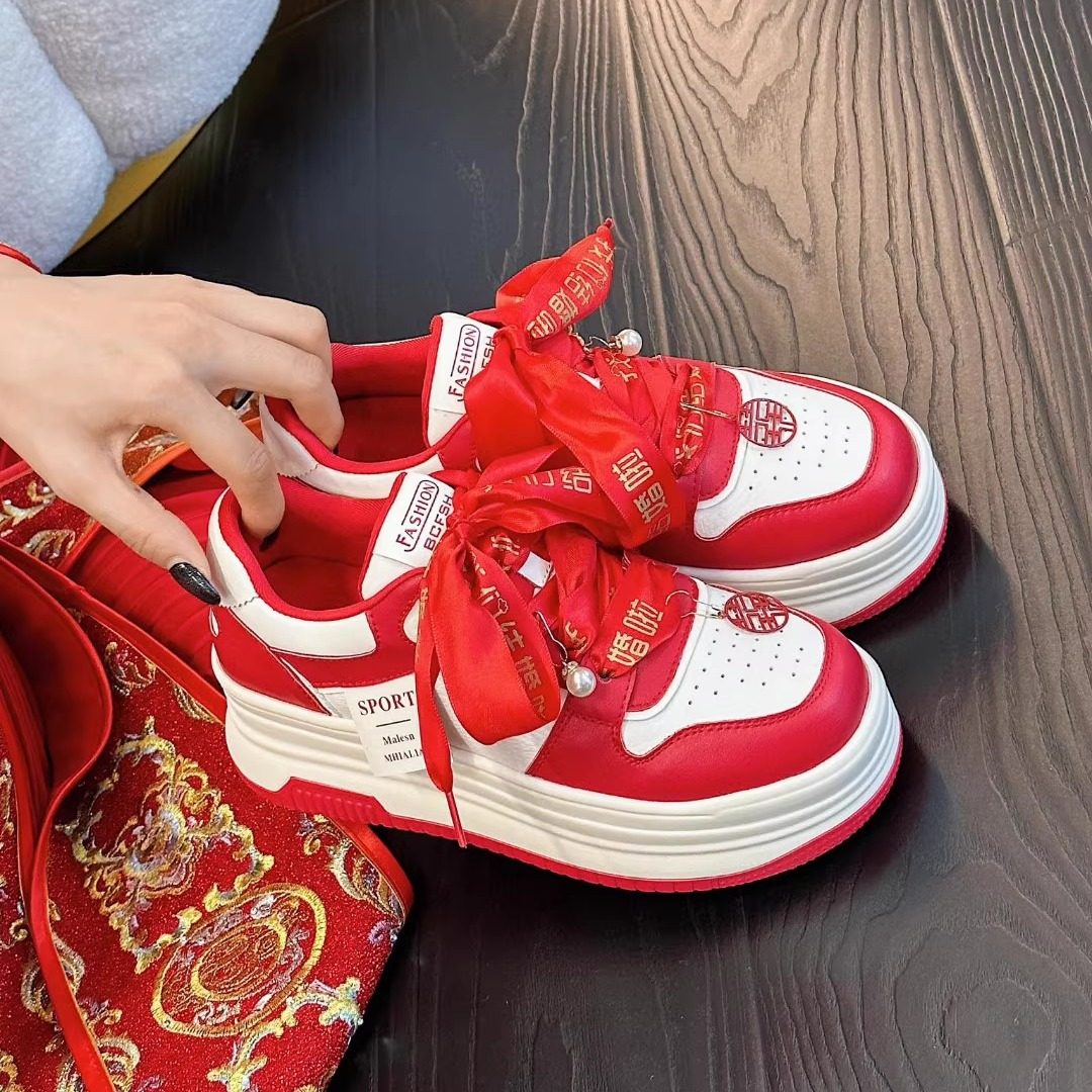 红色运动休闲鞋女真皮厚底新娘婚鞋2025春秋新款韩版百搭松糕鞋潮