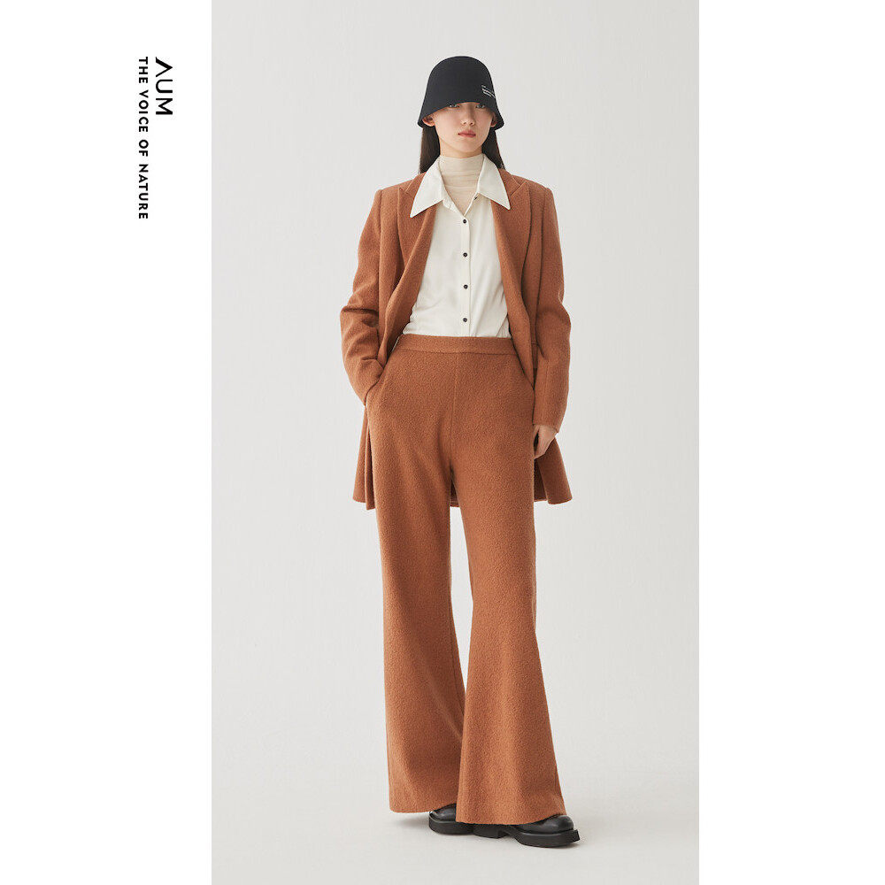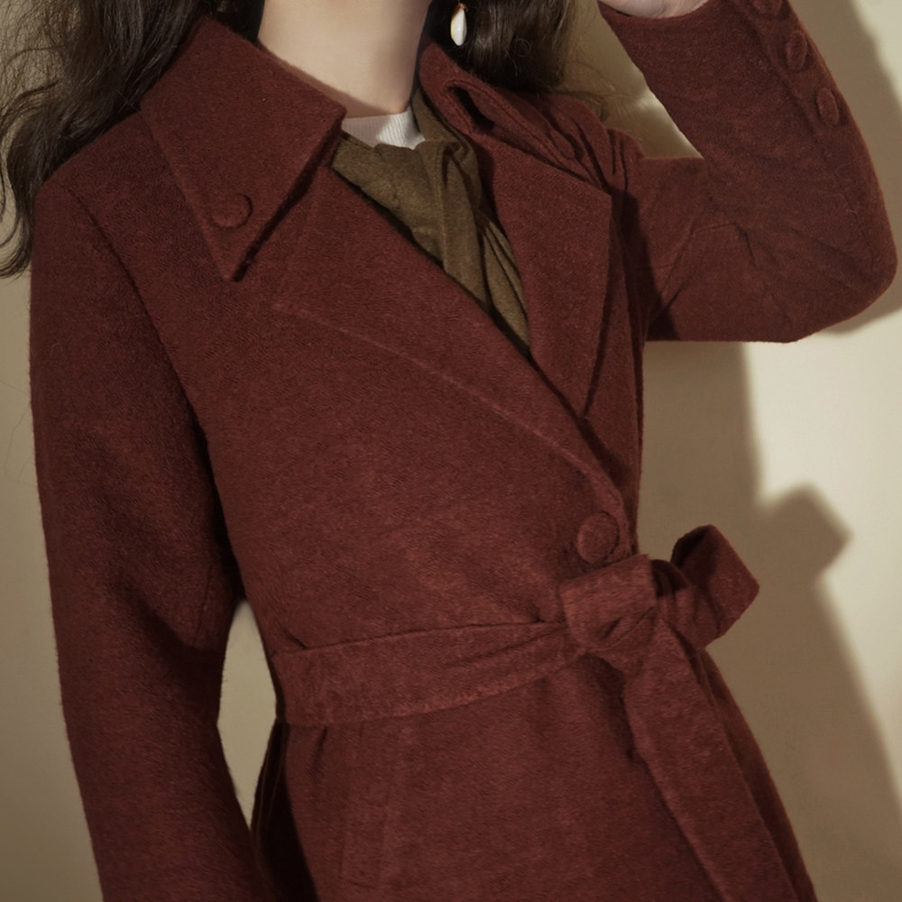 兰奕屋语原创设计深砖红色拿破仑领羊毛短大衣九分裤套装复古优雅