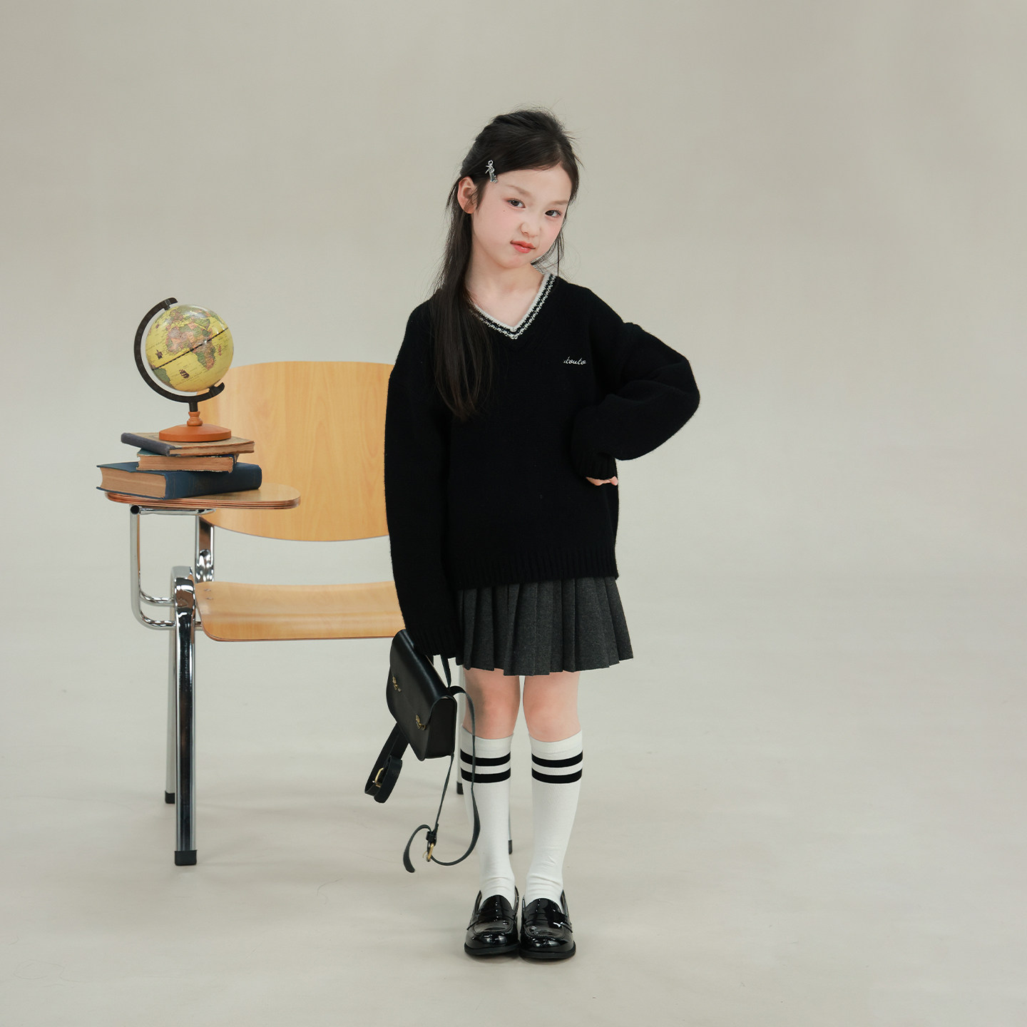 大耳象女童V领字母刺绣套头毛衣2026春季新款宝儿纯羊毛针织上衣