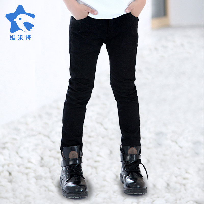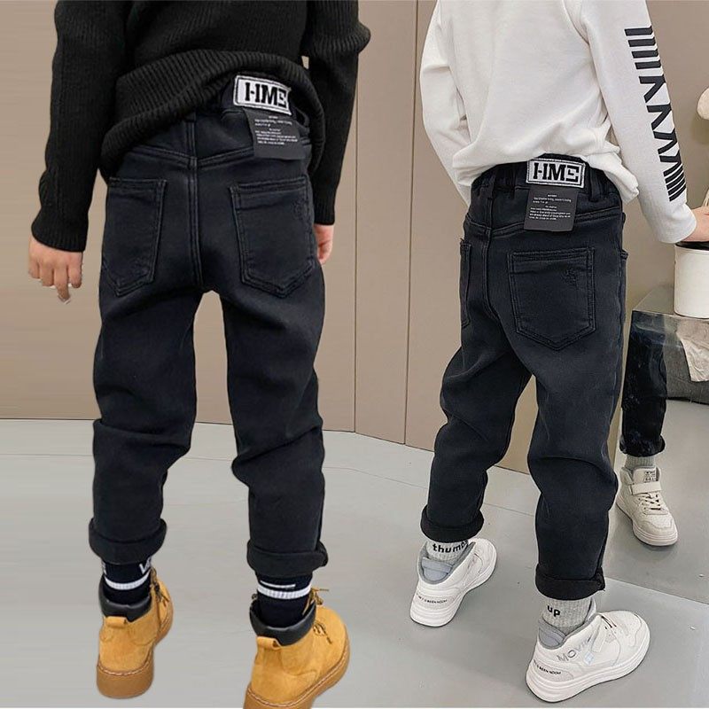 中大童加绒黑色牛仔裤直筒秋冬男童美式痞帅潮裤子修身休闲直筒裤
