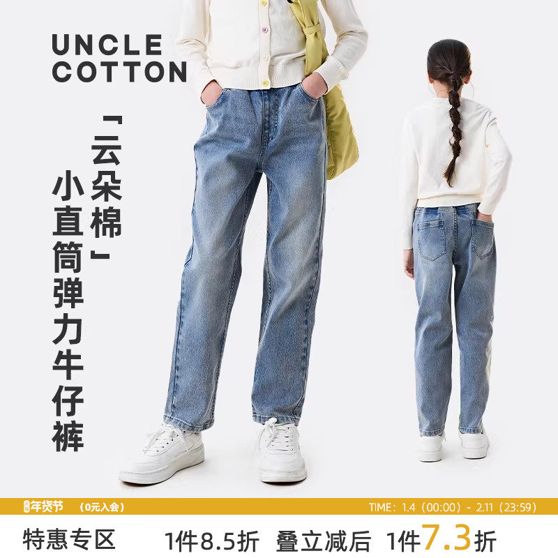 棉叔叔女童休闲直筒修身牛仔裤男童春秋新款云朵棉弹力水洗牛仔裤