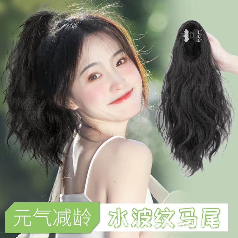 真发马尾假发低马尾微卷辫子自然梨花卷发大波浪绑带式超轻短发尾