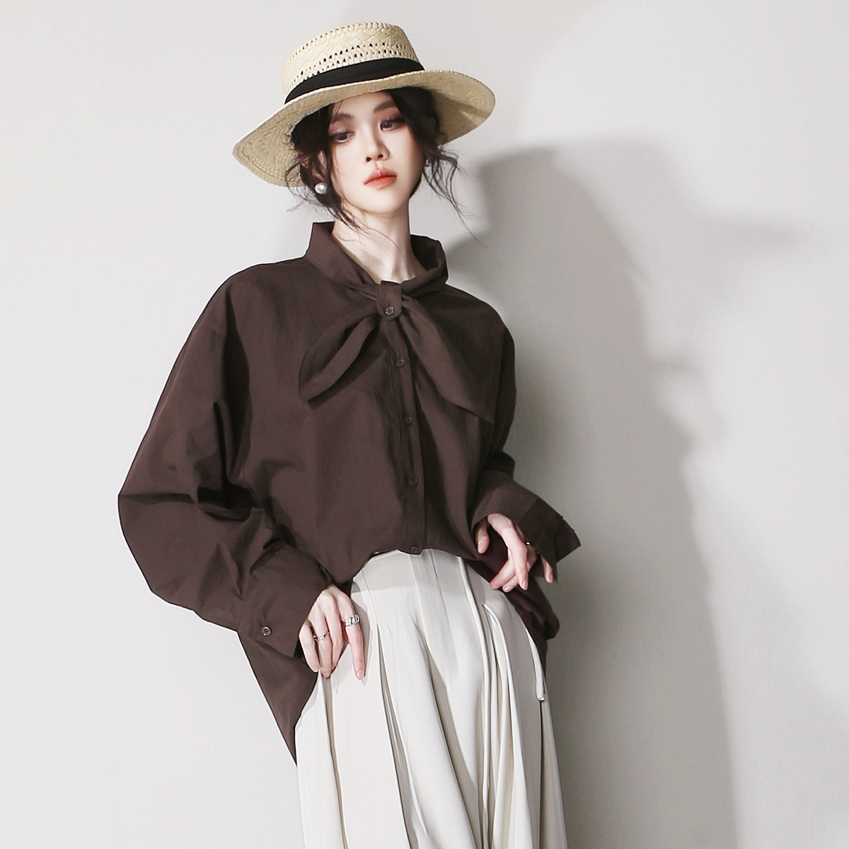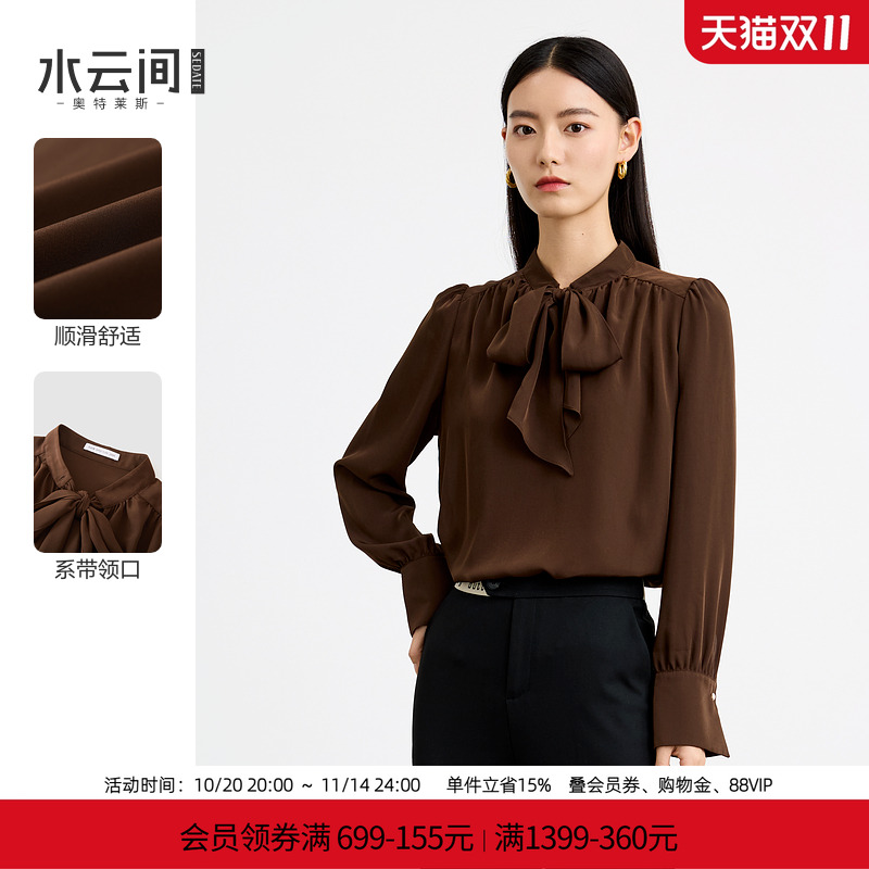 水云间咖色系带领结衬衫女飘带衬衣雪纺长袖上衣时尚通勤2025新款