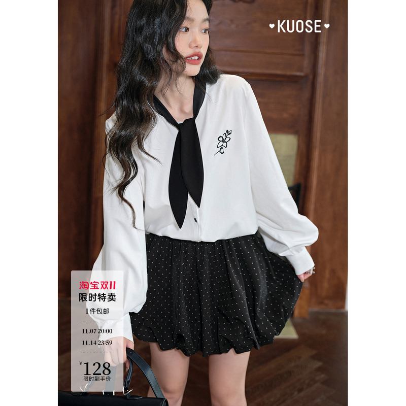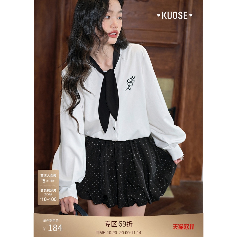 紫涵刺绣翻领长袖衬衫女春秋季新款设计感宽松显瘦内搭领结衬衣潮