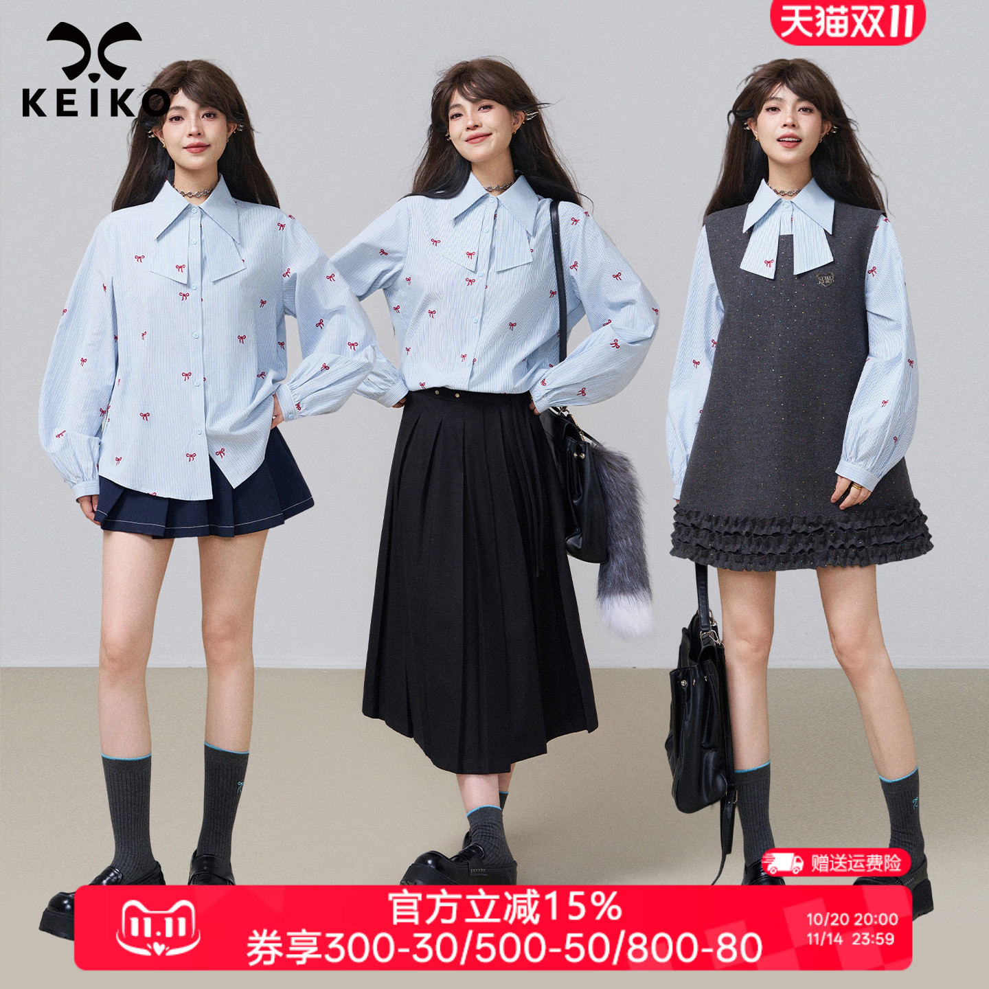 KEIKO 知性学术风蓝色绣花领结衬衫女25秋季都市通勤条纹长袖上衣