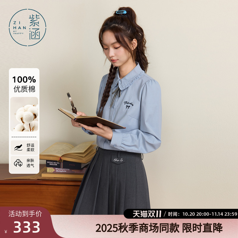 紫涵学院风长袖衬衫女2025年秋季新款木耳边翻领刺绣宽松领结衬衣