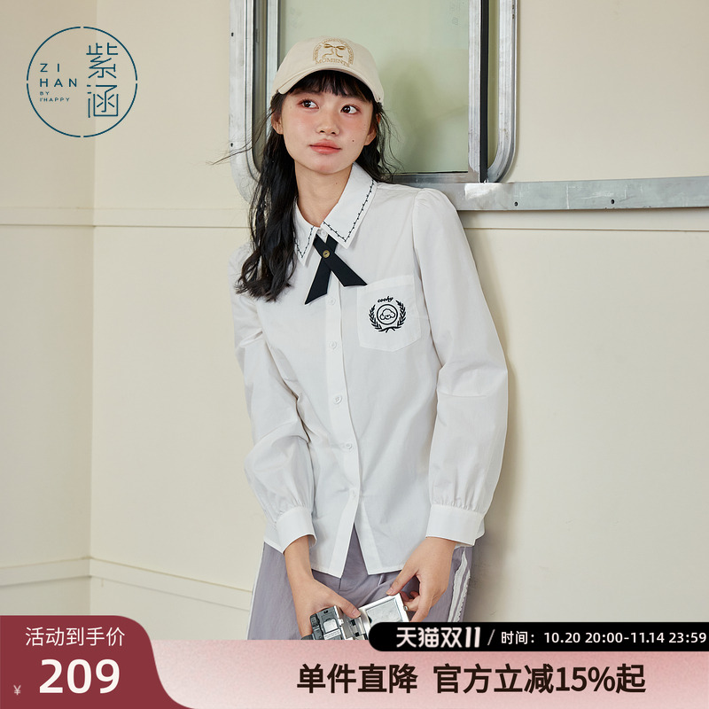 紫涵领结刺绣长袖衬衫女春秋季新款甜美学院风白色内搭翻领衬衣潮