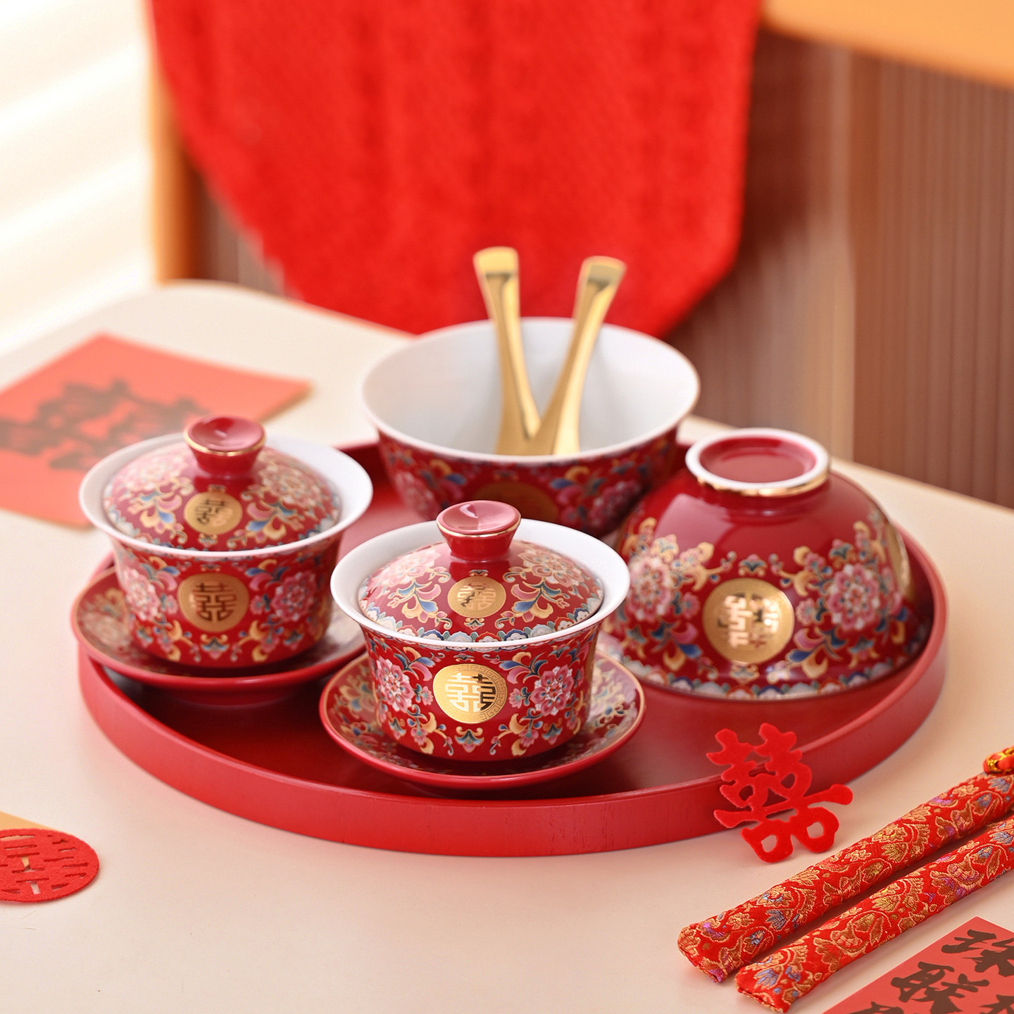 结婚敬茶杯套装珐琅彩婚庆红色改口杯子陶瓷喜碗新婚碗筷陪嫁用品