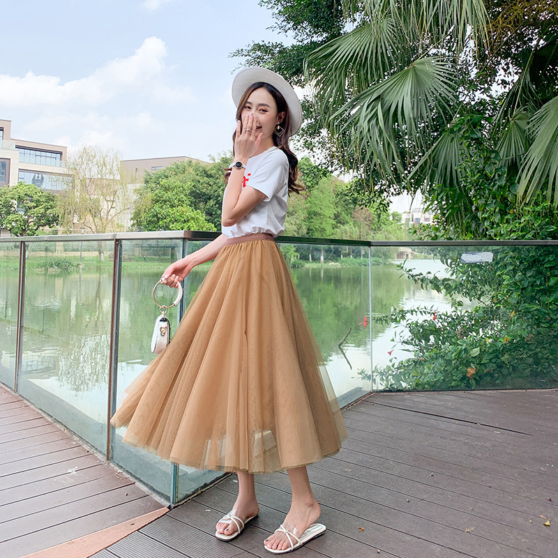 网纱裙子女春秋中长款超仙女高腰显瘦a字大码胖mm百褶半身长裙夏