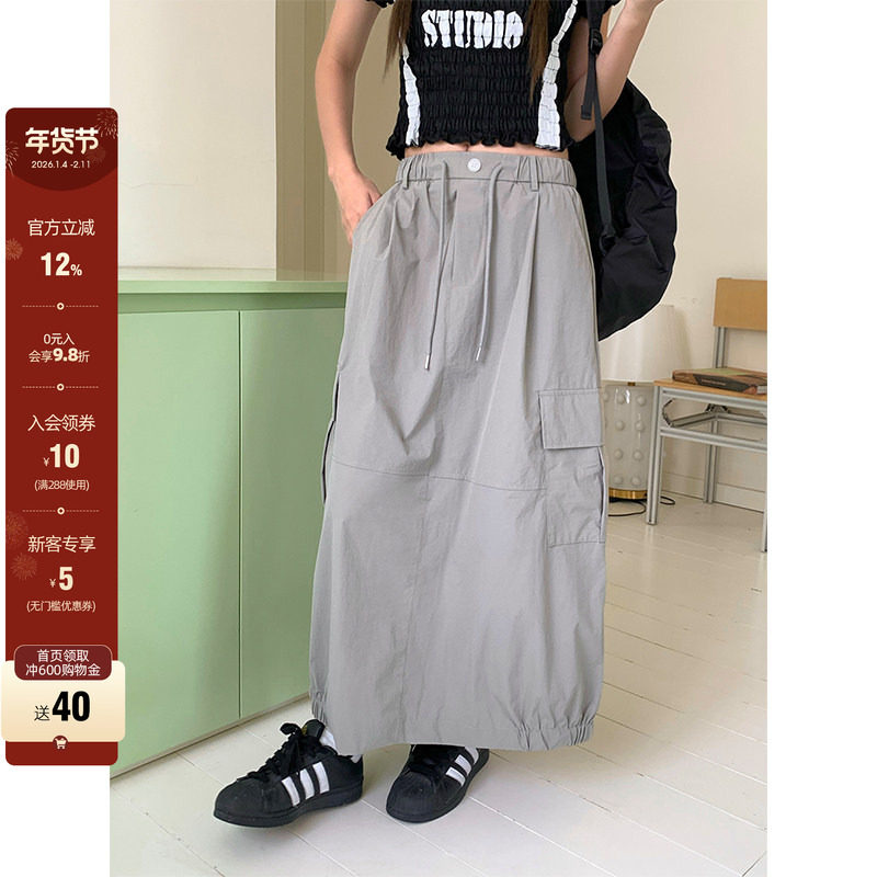 【现货】CCKOK 纯色简约机能工装半身长裙夏季休闲抽绳a字口袋裙