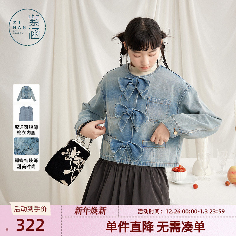 紫涵蝴蝶结圆领牛仔外套女春秋季新款甜美休闲做旧水洗蓝色短上衣