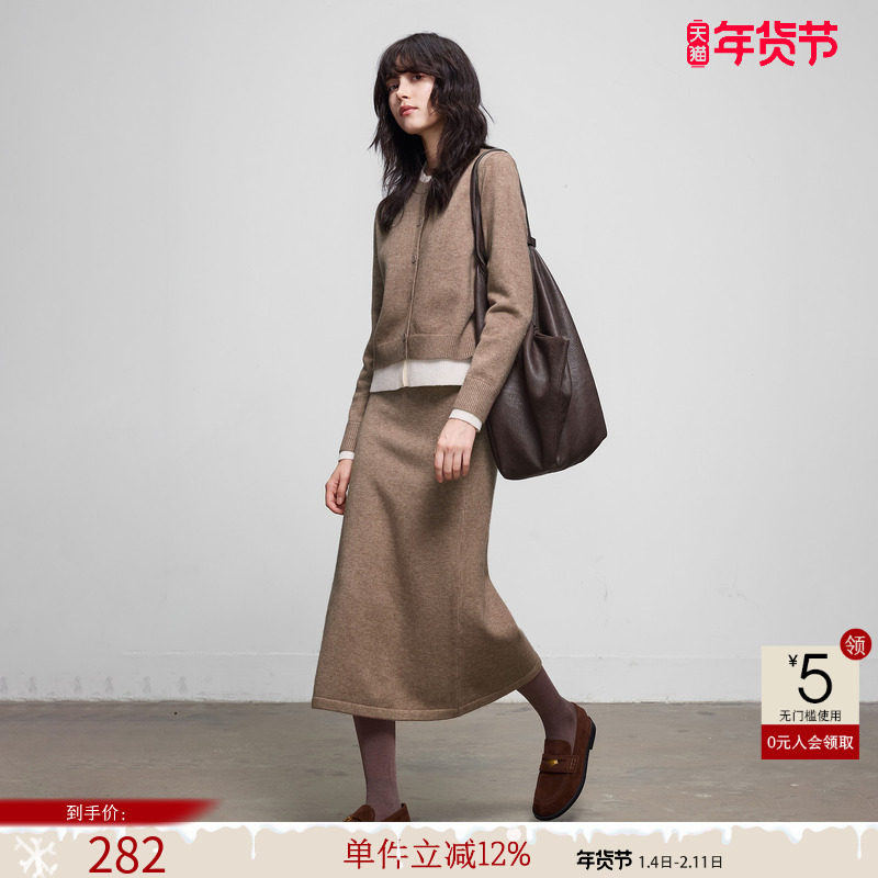 织物猪 焦糖奶霜 可露里穿搭棕色半身裙套装女冬季假两件针织衫