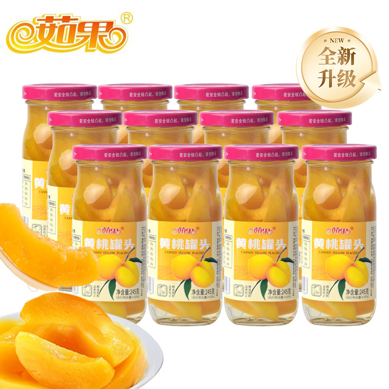茹果黄桃罐头245g*12瓶新鲜水果玻璃瓶装休闲零食即食整箱包邮