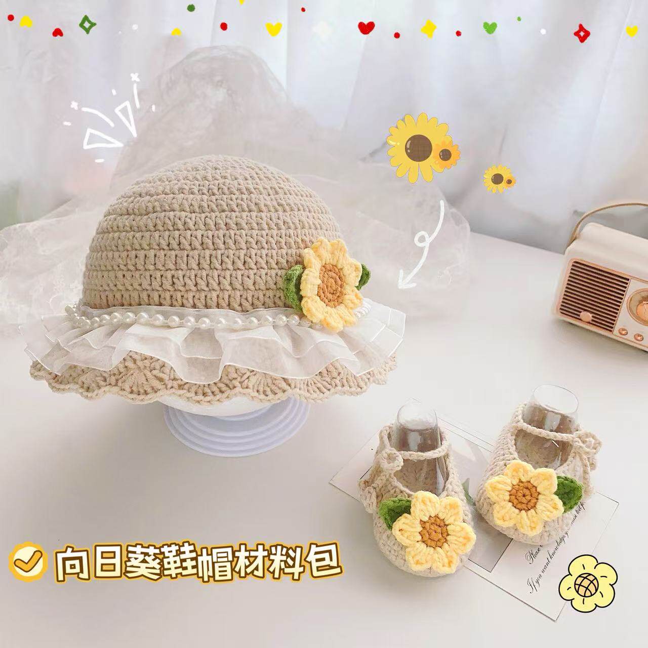 手工编织婴儿鞋帽春季花朵毛线钩针diy材料包宝宝鞋婴儿帽编织