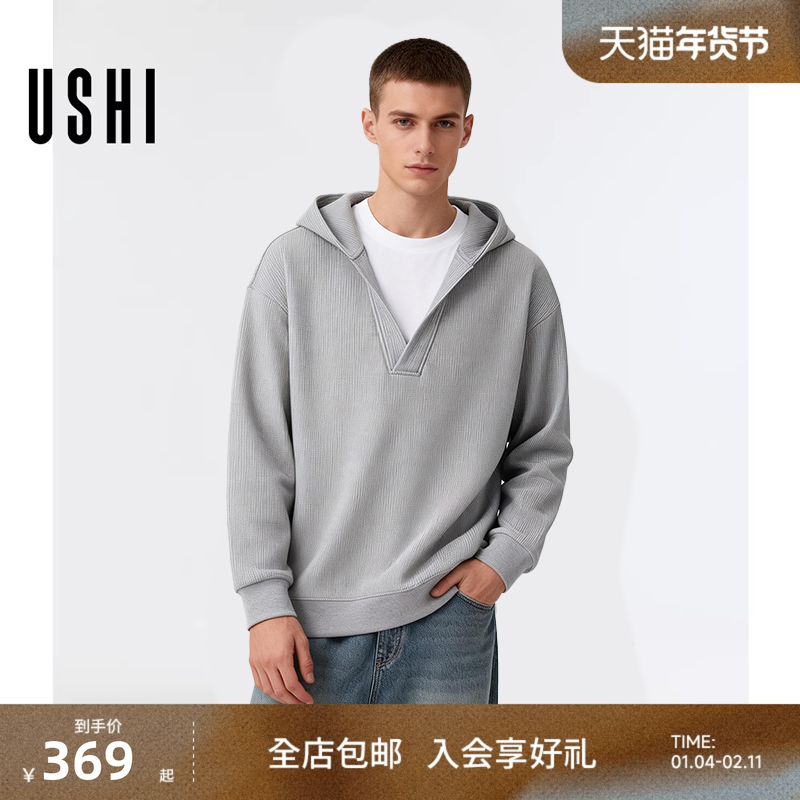 USHI悠时 男士假两件连帽卫衣简约灰色设计舒适休闲秋季潮流上衣