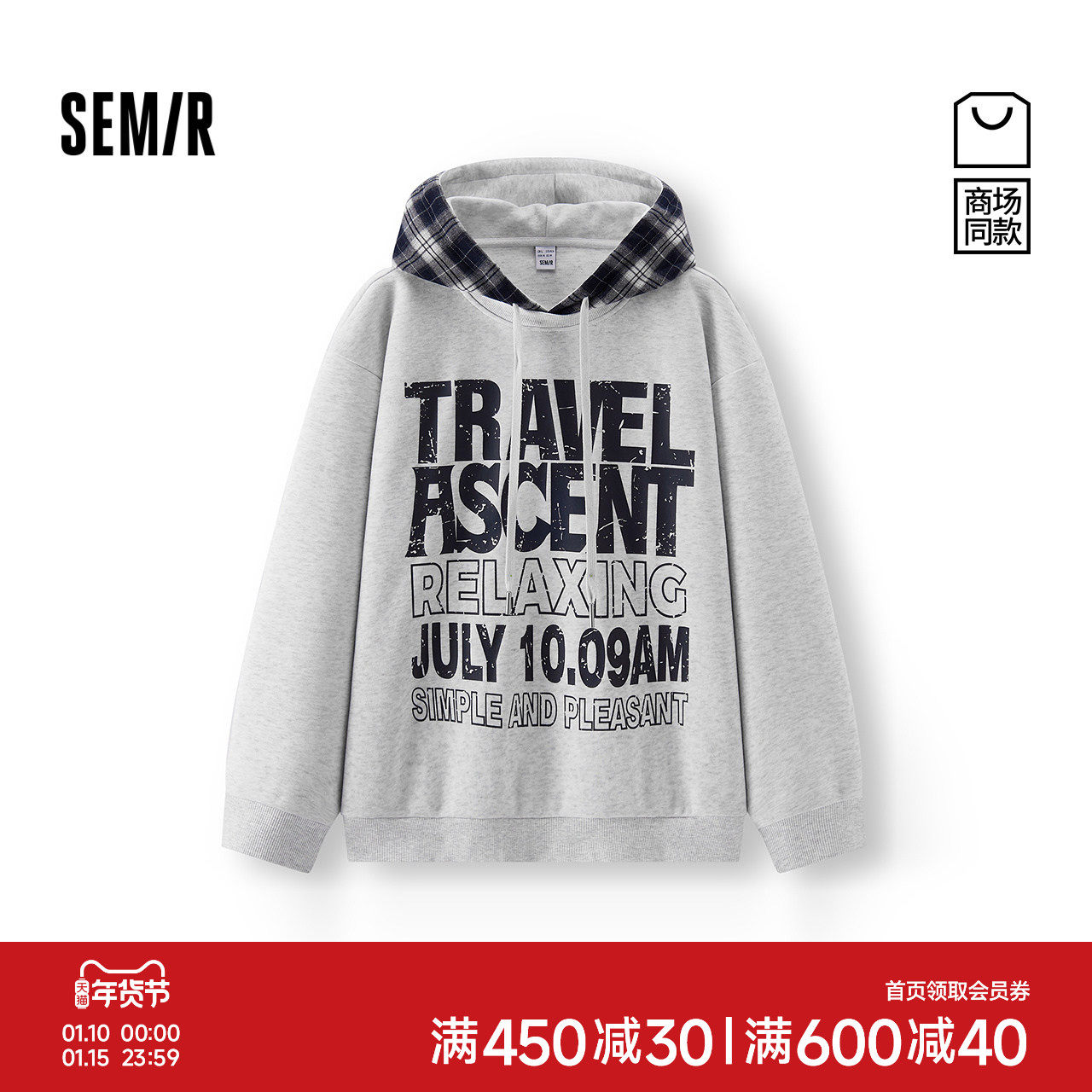 商场同款|森马卫衣男秋装假两件2025新款拼接格纹连帽上衣复古潮