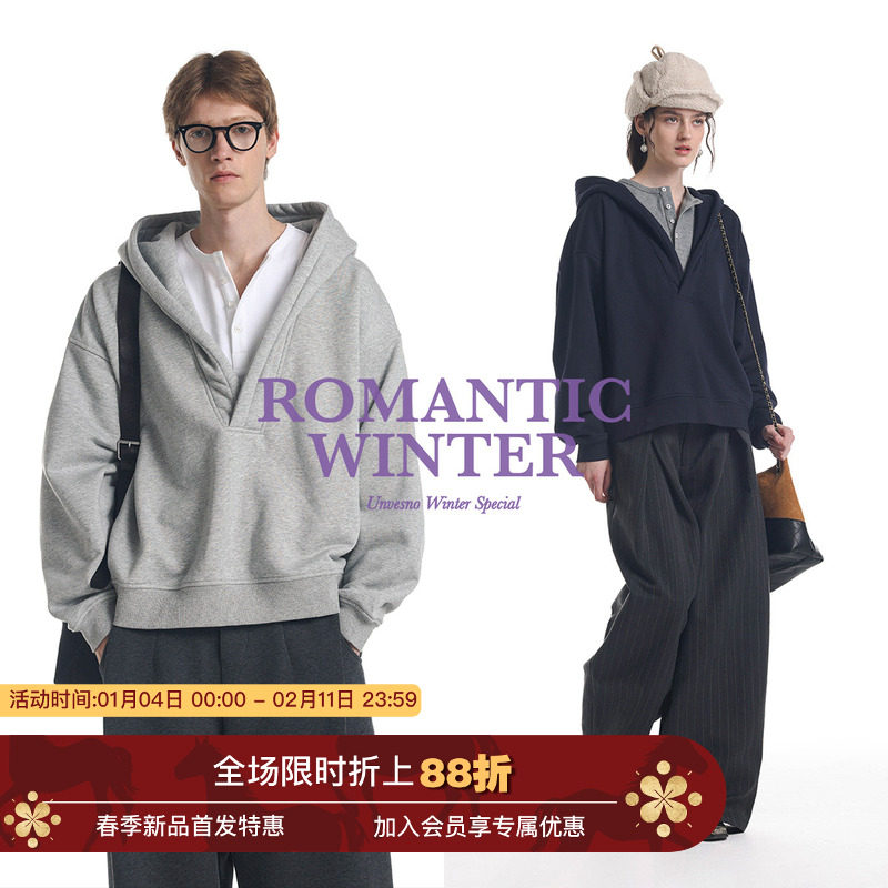 【加绒假两件】Unvesno(UN)静奢高智撞色亨利宽松休闲v领连帽卫衣