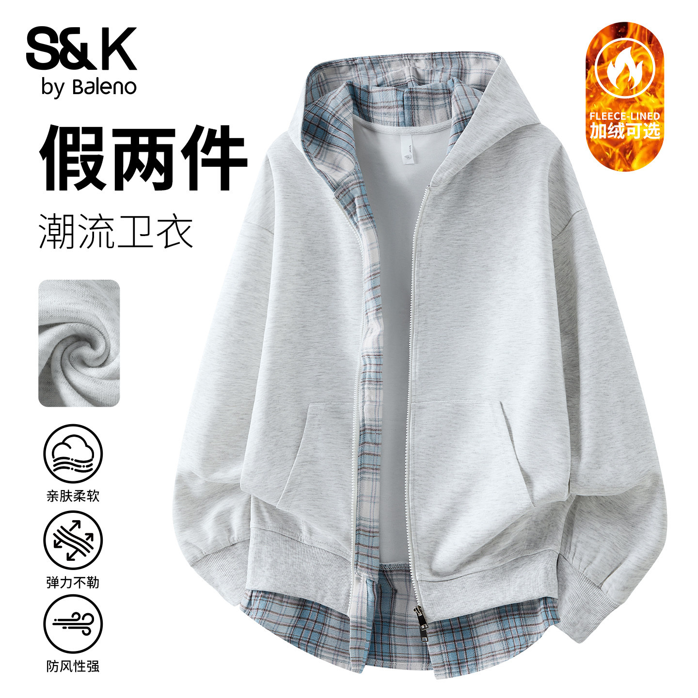 班尼路SK美式格子开衫假两件连帽卫衣2026春季宽松休闲夹克外套YS