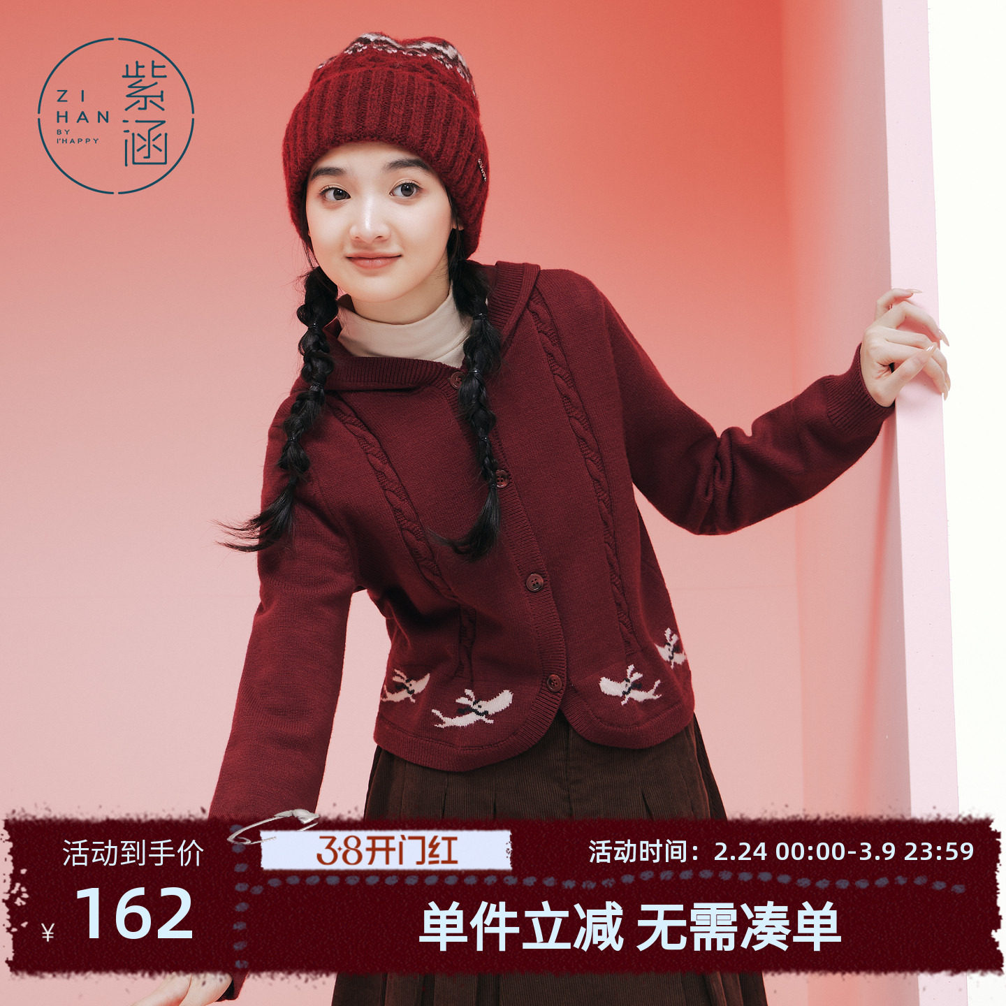 辰米范 红色针织开衫麻花短款毛衣女秋冬修身显瘦圆领上衣小外套