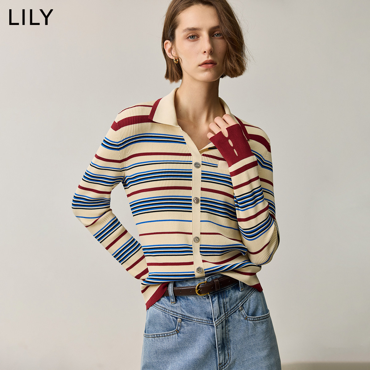 LILY秋新款复古翻领气质休闲撞色条纹修身针织开衫外套女短款