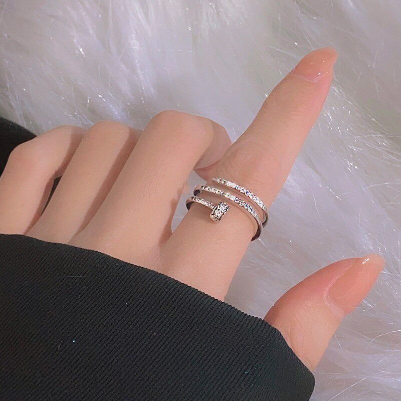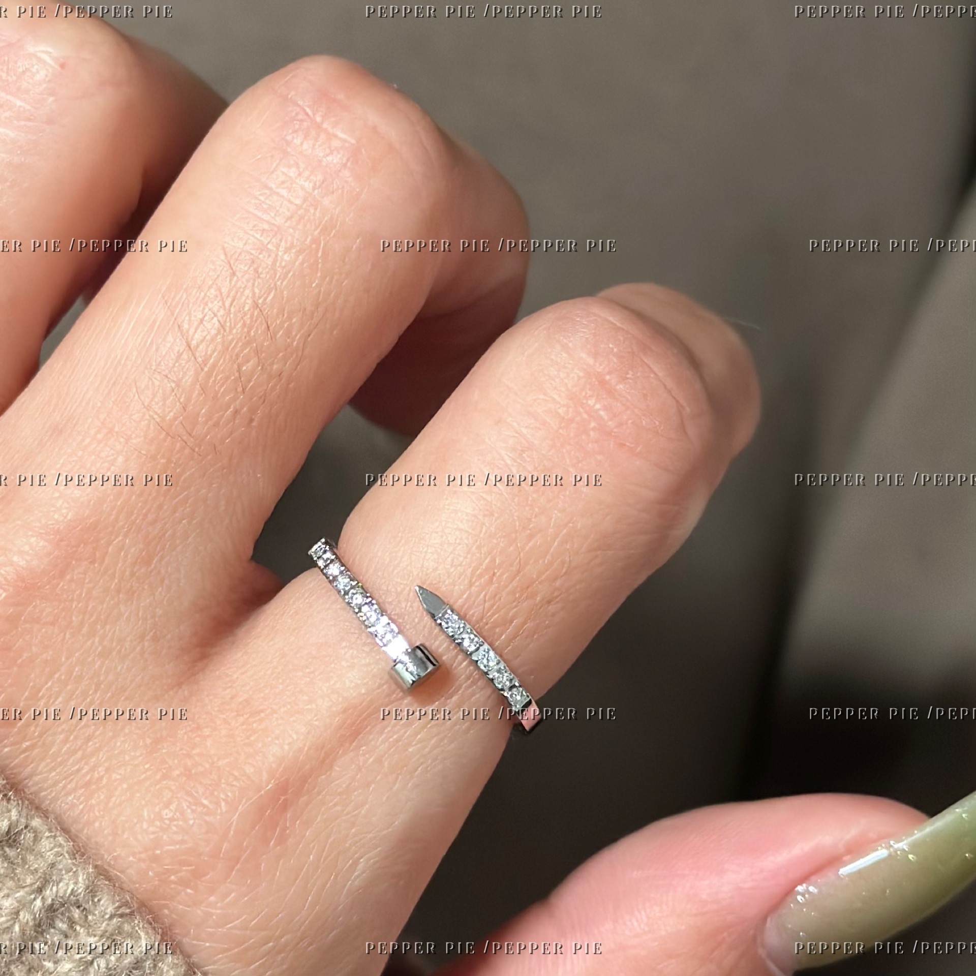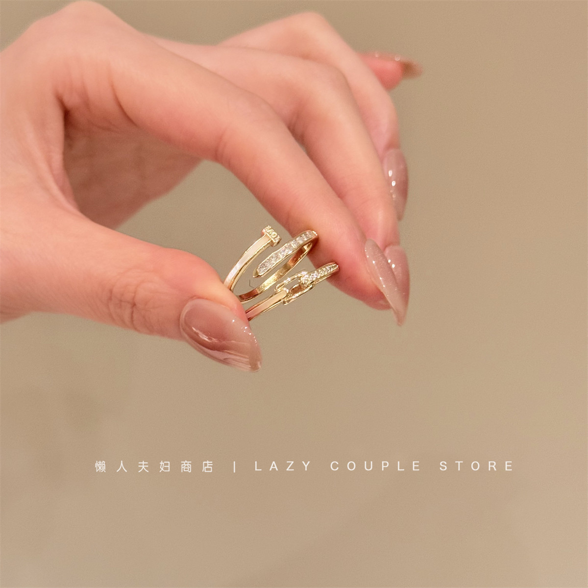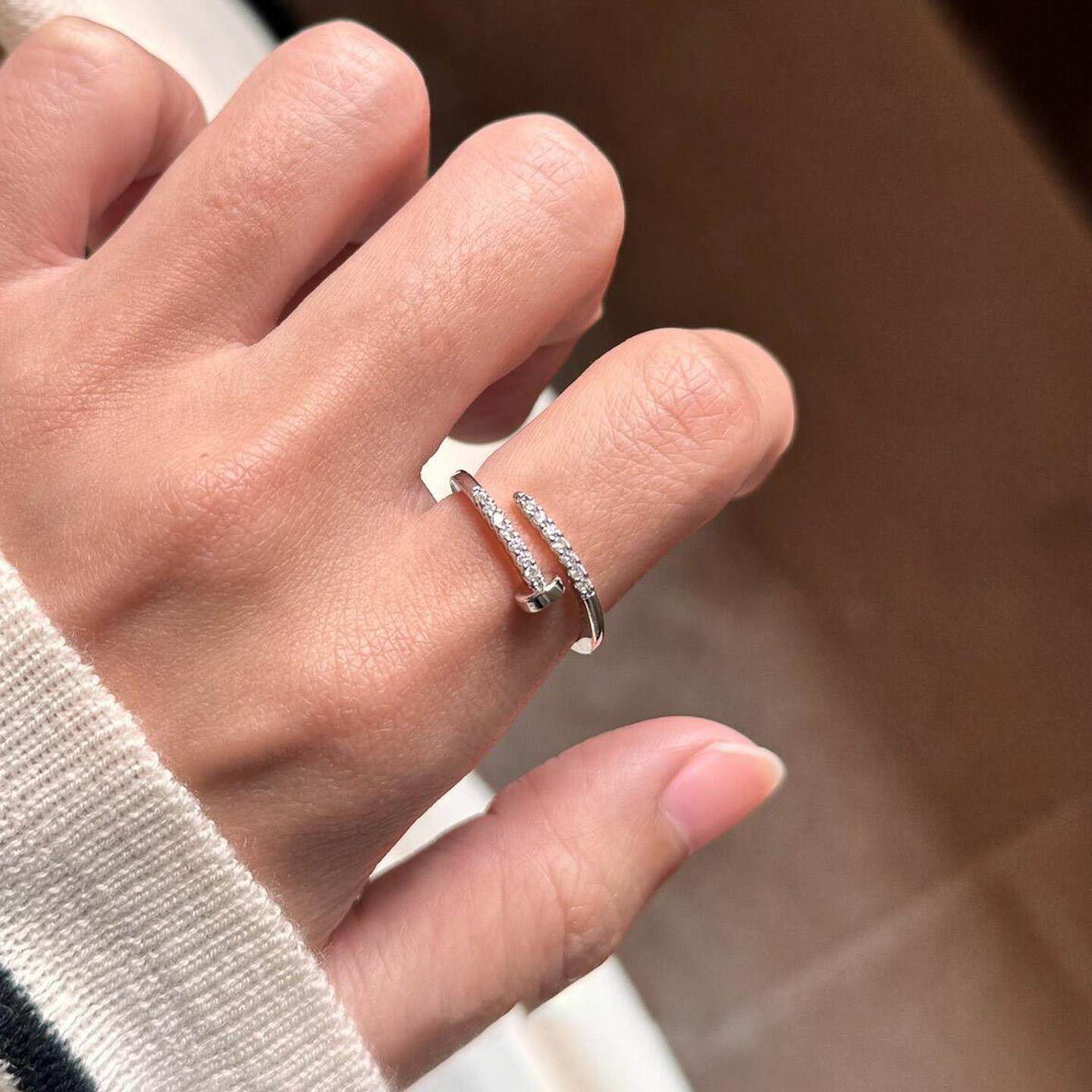 韩国新款镶钻弯曲钉子开口戒指女小众设计感时髦独特指环食指戒子