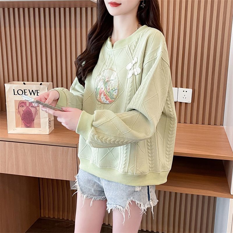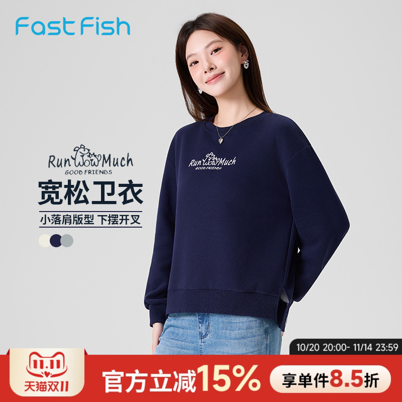 快鱼卫衣女士2025年秋新圆领宽松休闲下摆开叉上衣刺绣miu系卫衣