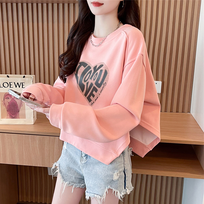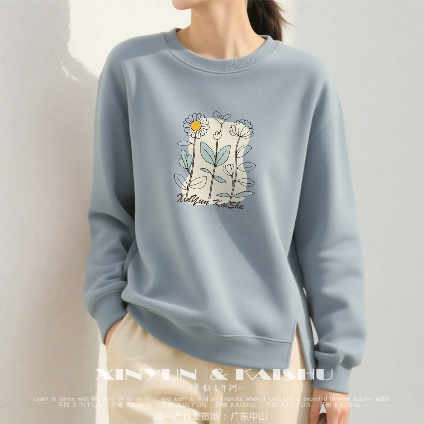 纯棉圆领卫衣女春秋新款韩版宽松显瘦百搭印花开叉长袖上衣外套女