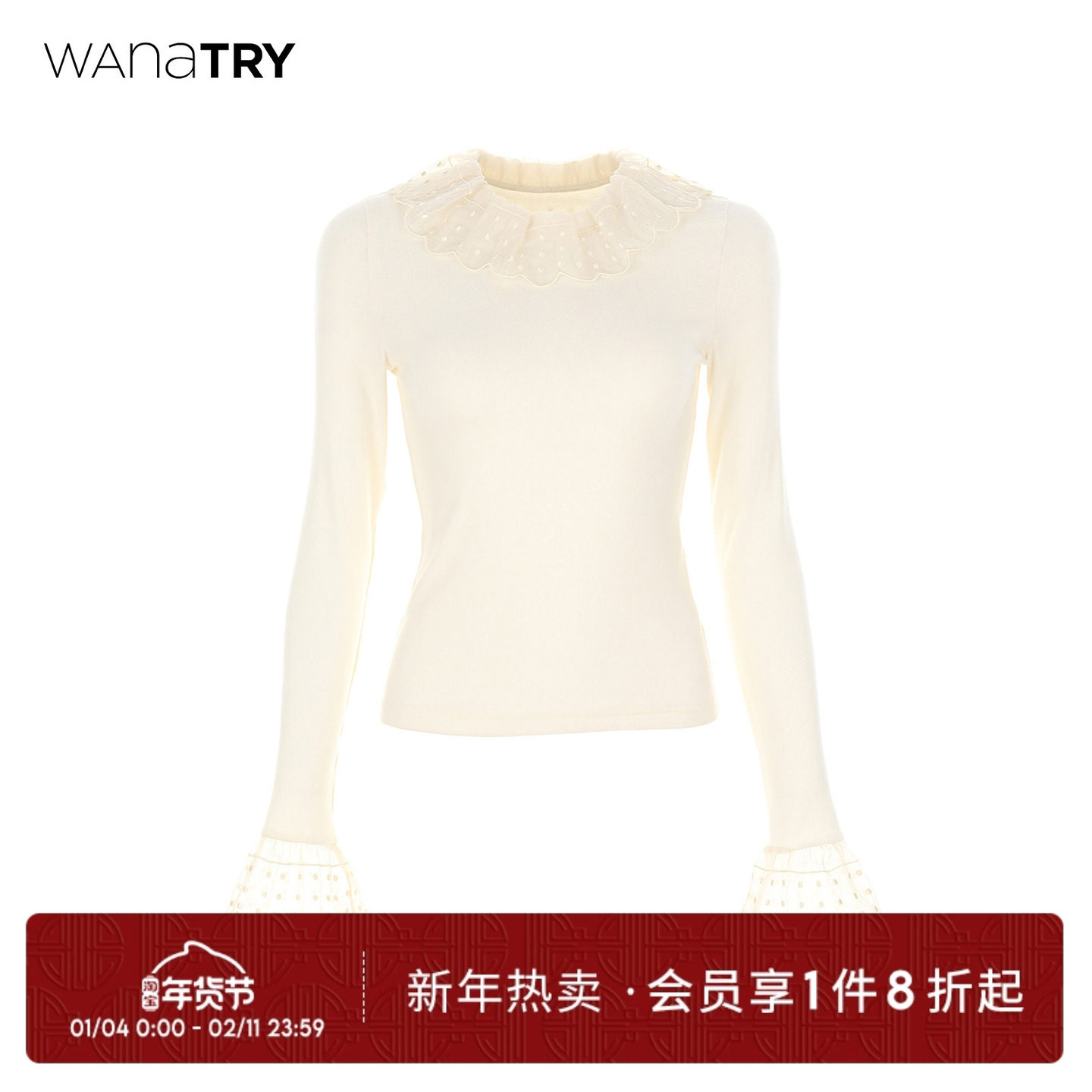 wana try刺绣花边领口宫廷感米白色百搭打底衫2025秋季新款上衣