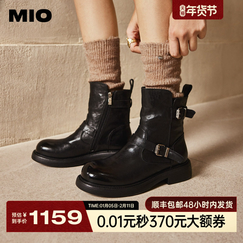 MIO米奥加绒褶皱马丁靴金属粗跟靴子冬新款女鞋牛皮革切尔西短靴