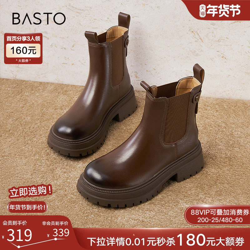 百思图冬季商场新款加绒牛皮切尔西烟筒靴厚底粗跟女短靴ULT01DD4