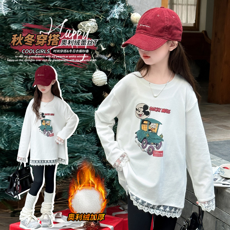 女童加绒百搭打底衫秋冬中长款圆领洋气蕾丝边拼接卡通长袖t恤潮