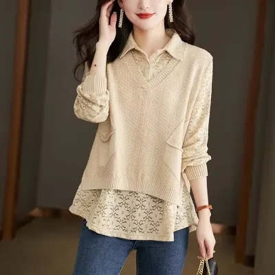 假两件镂空毛衣女2024新品秋季大码蕾丝衬衣中长款针织打底小衫潮