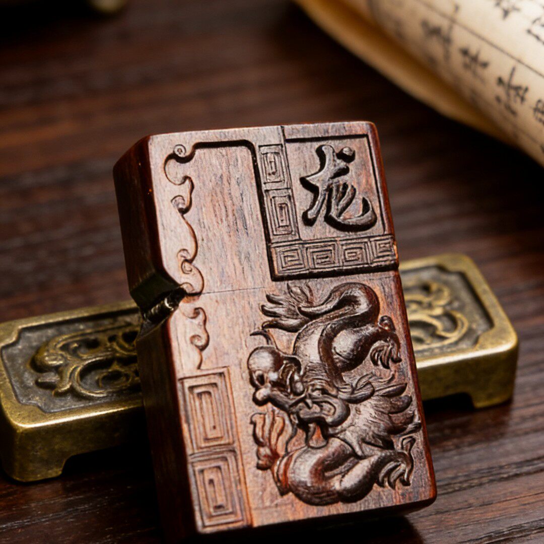打火机煤油实木小叶紫檀双面浮雕男士防风复古个性创意木雕打火机