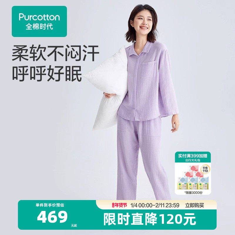 全棉时代睡衣女士褶皱纱家居服套装秋季纯棉透气长袖长裤秋装居家