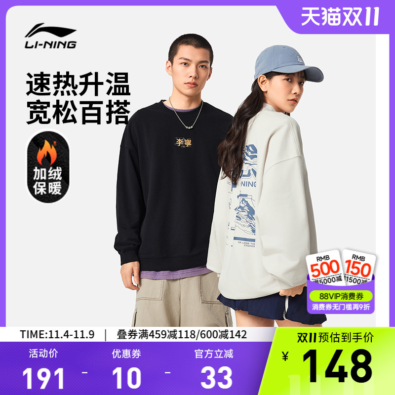 李宁卫衣女秋冬新款情侣圆领套头衫加绒加厚宽松保暖运动上衣男士