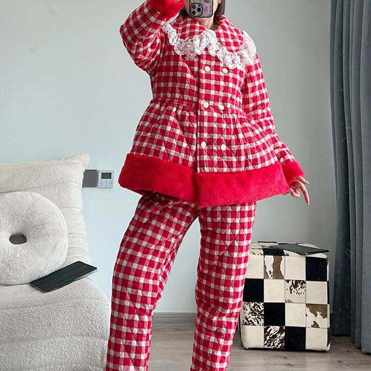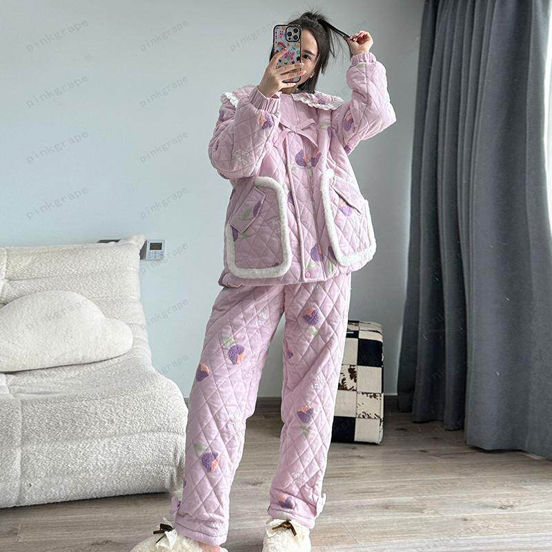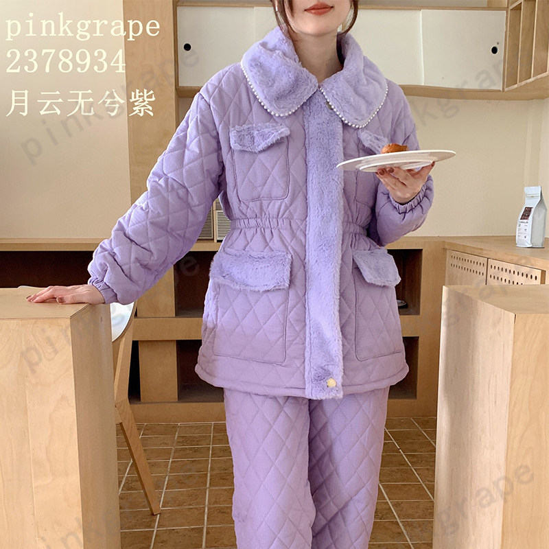 pink grape睡衣女士冬季加厚保暖珊瑚绒三层夹棉加厚家居服可外穿