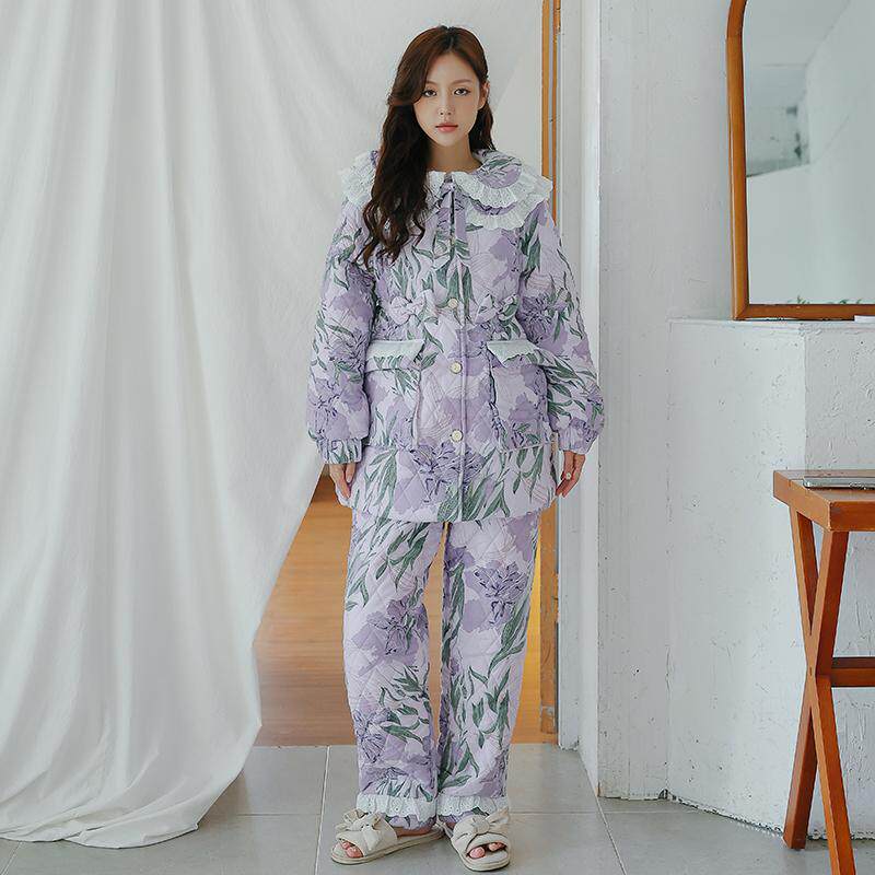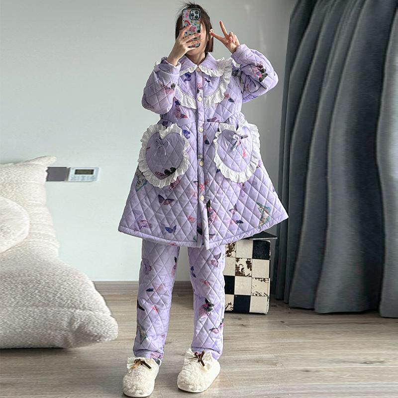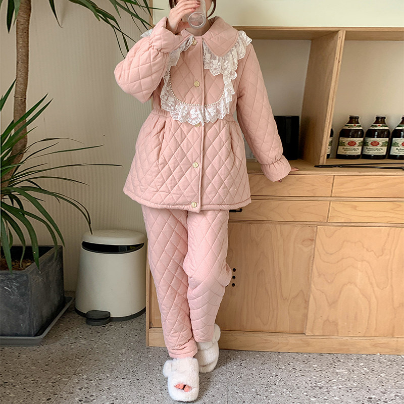 pink grape宫廷风冬季三层夹棉加厚法兰绒睡衣女保暖珊瑚绒家居服