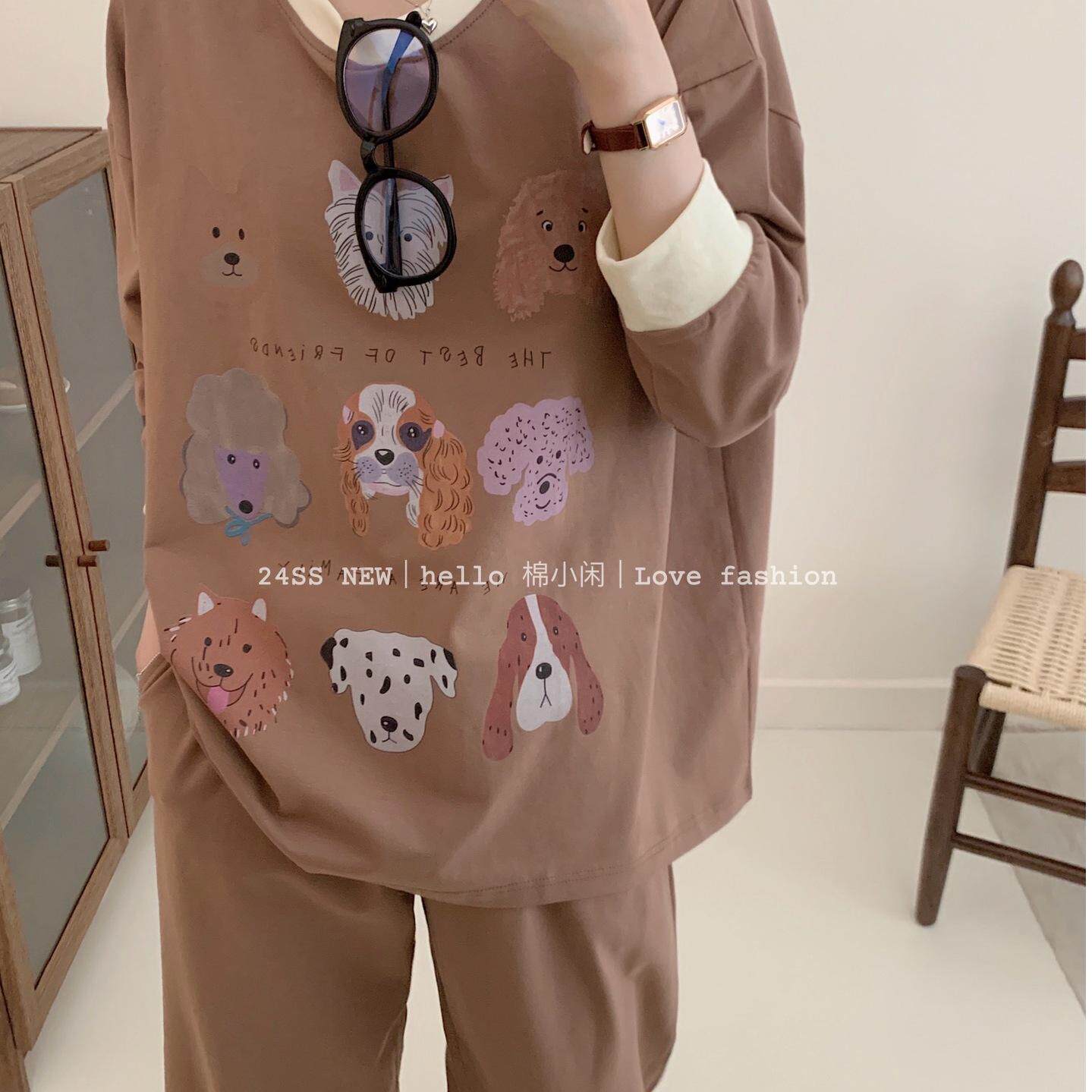 卡通狗狗宽松韩版女士圆领套装睡衣长袖长裤纯棉薄款收口女家居服