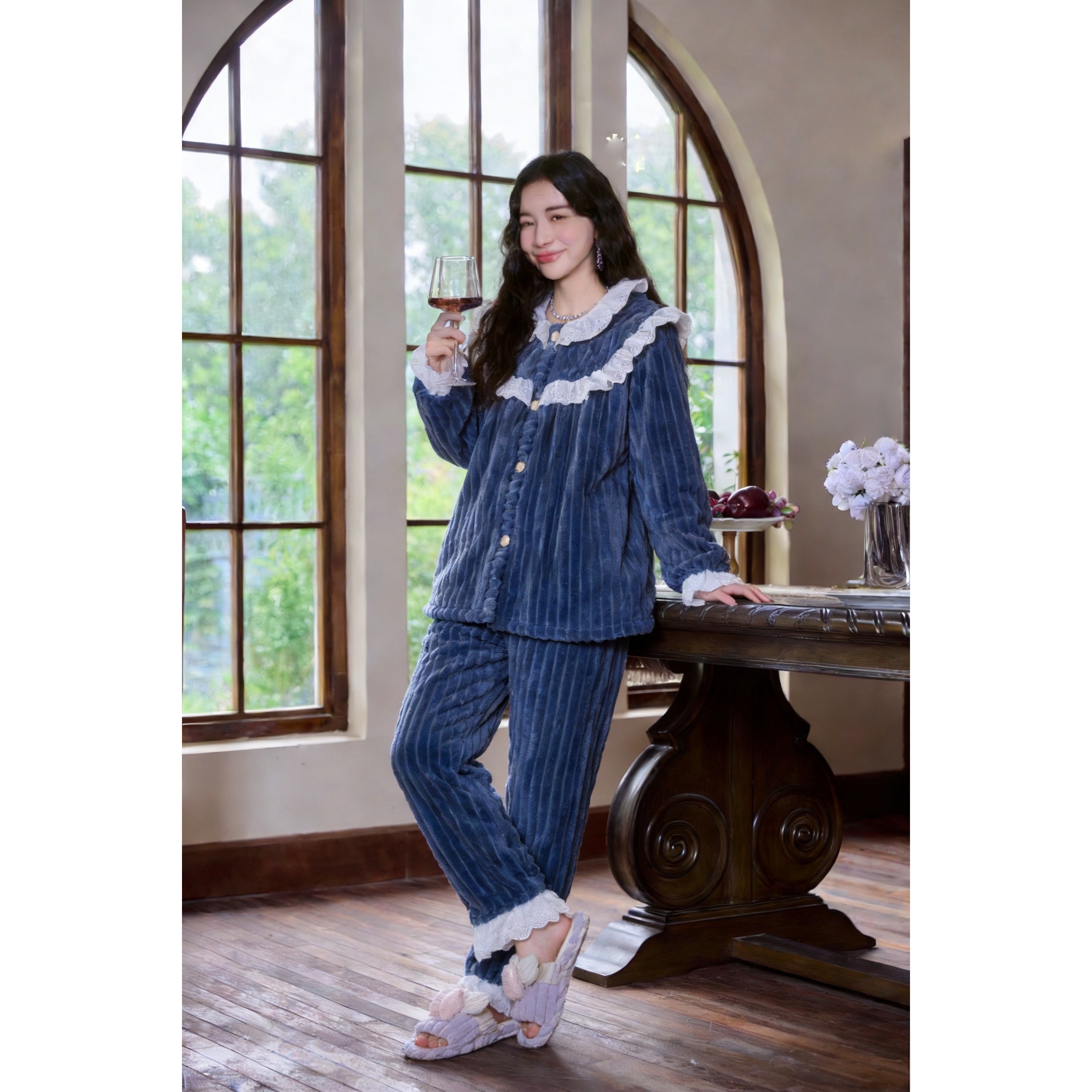 pink grape睡衣女宫廷风法兰绒冬季三层夹棉加厚珊瑚绒可外穿套装