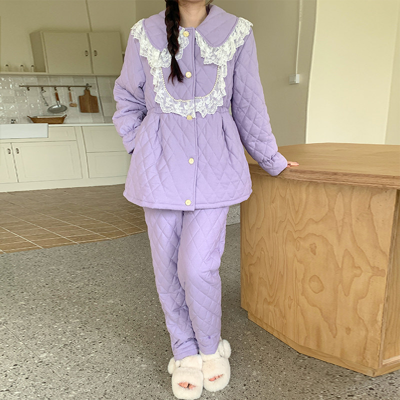 pink grape睡衣女宫廷风可外穿法兰绒冬季三层夹棉加厚珊瑚绒套装